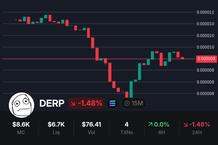 DERP ($DERP) 🪅 CA: 3EU55vUDEhAjXM8bjczhnckVz2yCS7dwknh3AU8smoon 🅲 ⛽️ LP: FPu3gFL6HgBvLcatgVTC7CQQ4ZgEJNtDhsZRdkys1KzF 🅲 🔎 Search on X 🎯 Exchange: Meteora DAMMV2 💰 Token Price: $0.0008558 💡 Market Cap: $821.43K 💧 Liquidity: $147.75K 🔥 Burn: 100% 👤 Renounced:…