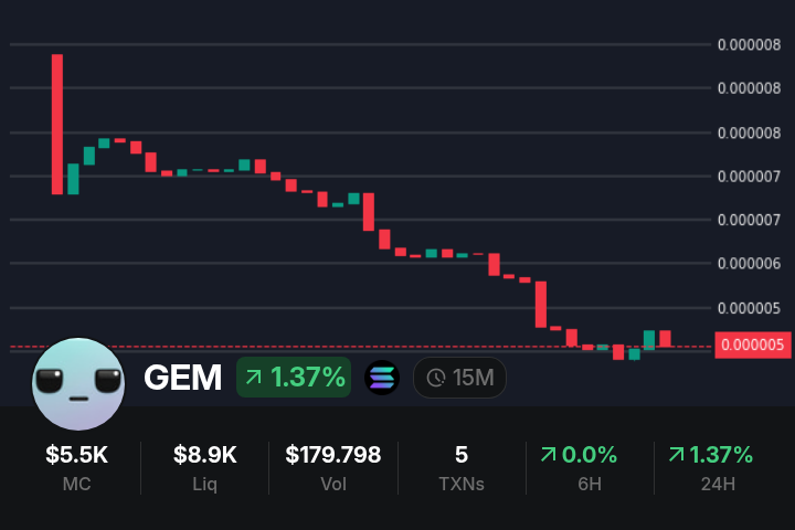 MCAP: $140.74K (+2.47K%) | 24H VOL: $260.96K | Real-time trading data and liquidity info for Hidden Gem (GEM) on SOL blockchain. Get insights on the latest price, volume, and market cap.