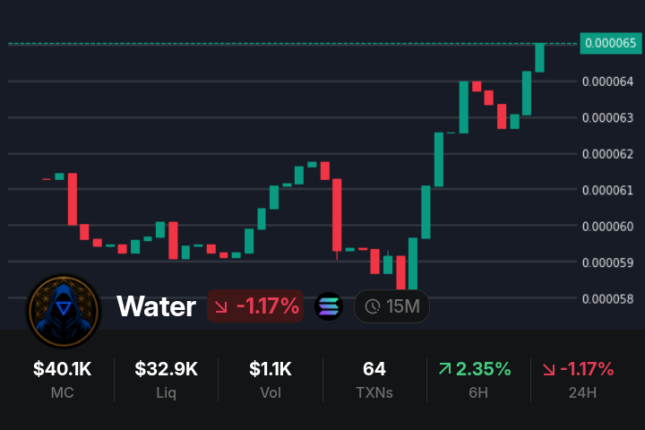 MCAP: $2.42M (+18.5K%) | 24H VOL: $3.86M | Real-time trading data and liquidity info for Water (Water) on SOL blockchain. Get insights on the latest price, volume, and market cap.