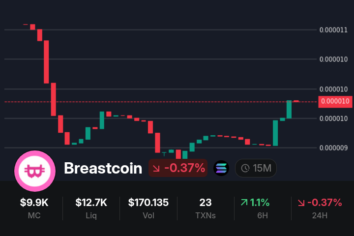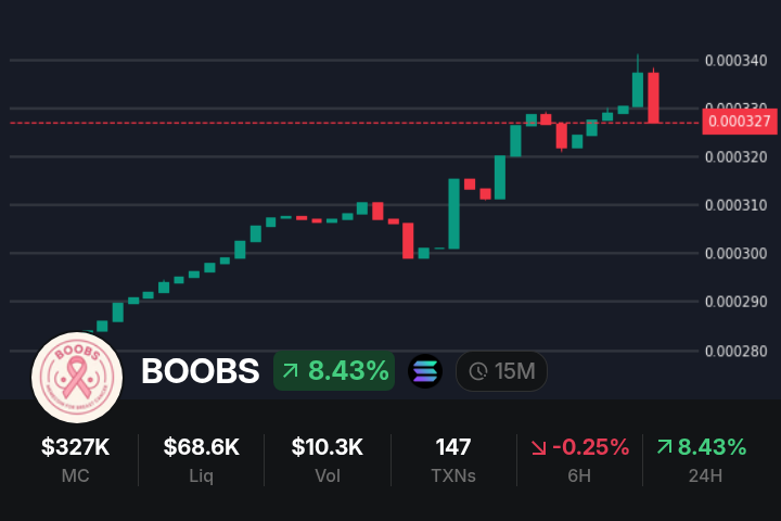 MCAP: $174.87K (+57.3%) | 24H VOL: $133.49K | Real-time trading data and liquidity info for Boobs (BOOBS) on SOL blockchain. Get insights on the latest price, volume, and market cap.
