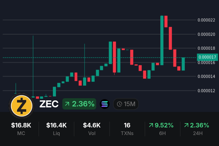 MCAP: $102.19K (+1.44K%) | 24H VOL: $395.75K | Real-time trading data and liquidity info for Zcash (ZEC) on SOL blockchain. Get insights on the latest price, volume, and market cap.