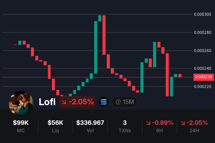 MCAP: $186.45K (-7.84%) | 24H VOL: $3.61K | Real-time trading data and liquidity info for Lofi (Lofi) on SOL blockchain. Get insights on the latest price, volume, and market cap.