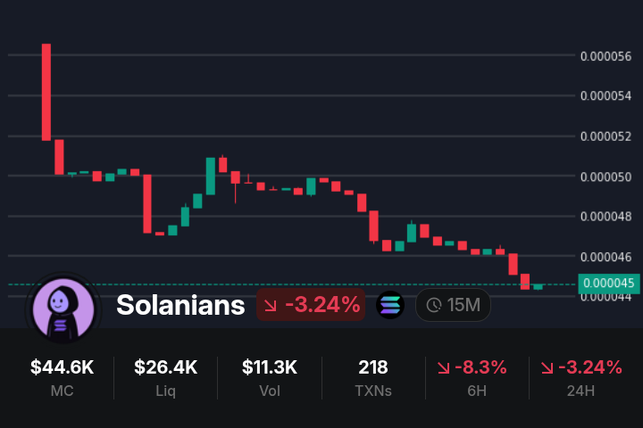 MCAP: $281.54K (+3.72K%) | 24H VOL: $1.6M | Real-time trading data and liquidity info for Solanians (Solanians) on SOL blockchain. Get insights on the latest price, volume, and market cap.