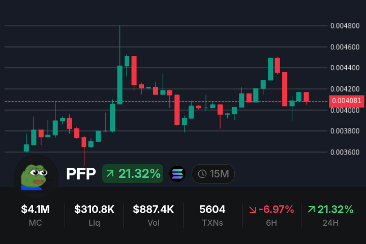 MCAP: $4.31M (+149.51%) | 24H VOL: $3.24M | Real-time trading data and liquidity info for Pumpfun Pepe (PFP) on SOL blockchain. Get insights on the latest price, volume, and market cap.