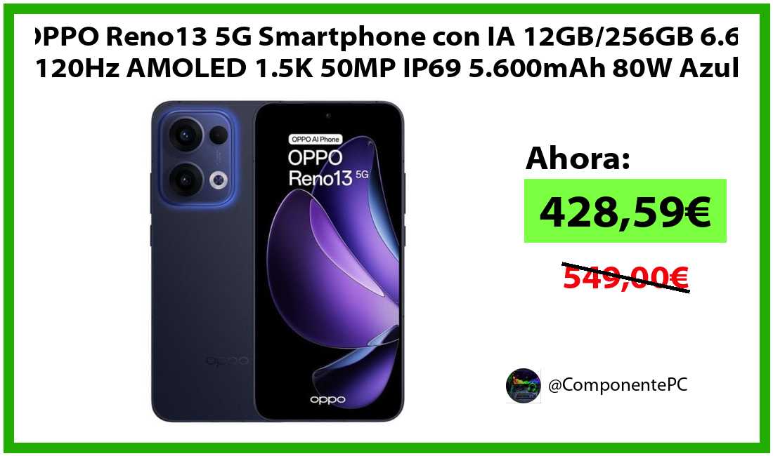 πΉOPPO Reno13 5G Smartphone con IA 12GB/256GB 6.6" 120Hz AMOLED 1.5K 50MP IP69 5.600mAh 80W Azul solo 428,59β¬βοΈβ‘οΈ(PVP: 549,00β¬)