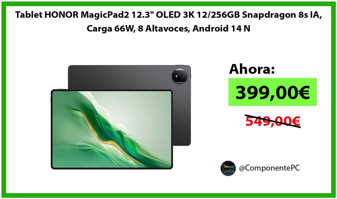 🔹Tablet HONOR MagicPad2 12.3" OLED 3K 12/256GB Snapdragon 8s IA, Carga 66W, 8 Altavoces, Android 14 N solo 399,00€❗️⚡️(PVP: 549,00€)