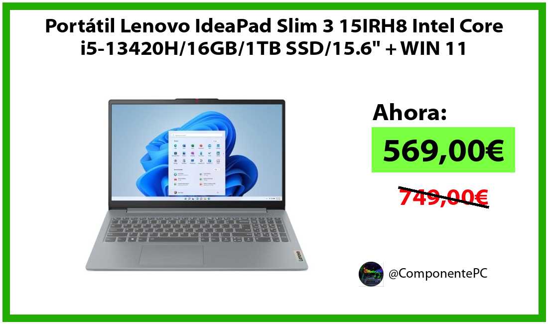 🔹Portátil Lenovo IdeaPad Slim 3 15IRH8 Intel Core i5-13420H/16GB/1TB SSD/15.6" + WIN 11 solo 569,00€❗️⚡️(PVP: 749,00€)