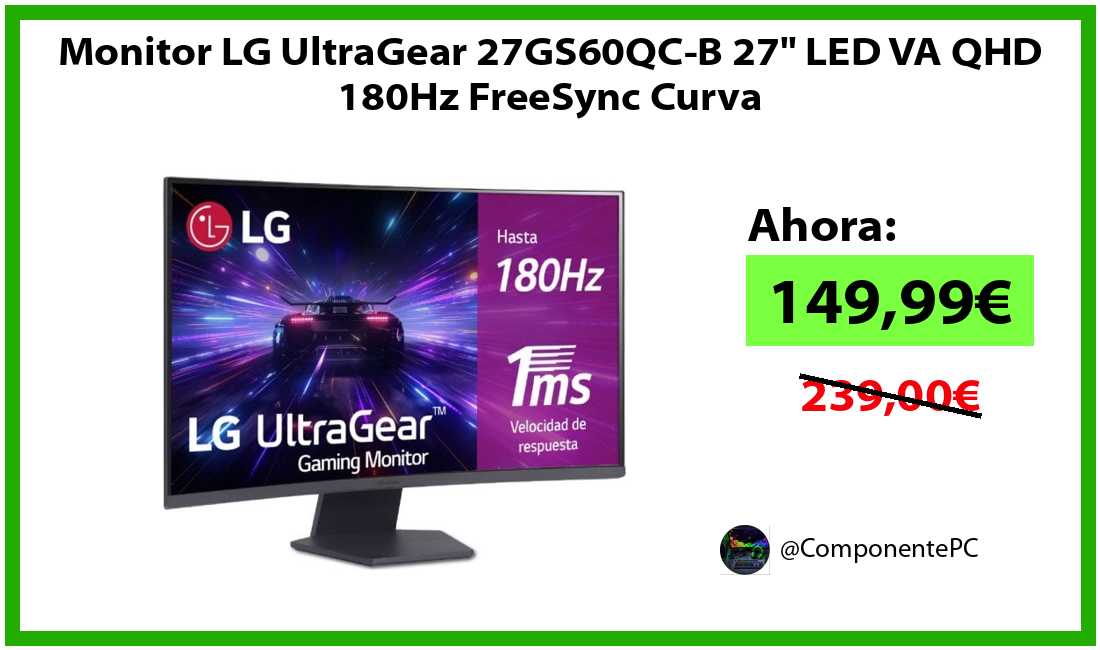 🔹Monitor LG UltraGear 27GS60QC-B 27" LED VA QHD 180Hz FreeSync Curva solo 149,99€❗️⚡️