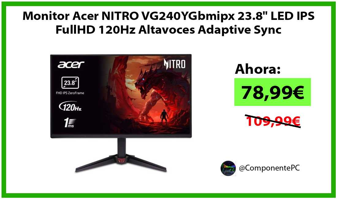 🔹Monitor Acer NITRO VG240YGbmipx 23.8" LED IPS FullHD 120Hz Altavoces Adaptive Sync solo 78,99€❗️⚡️(PVP: 109,99€)