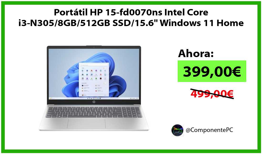 🔹Portátil HP 15-fd0070ns Intel Core i3-N305/8GB/512GB SSD/15.6" Windows 11 Home solo 399,00€❗️⚡️