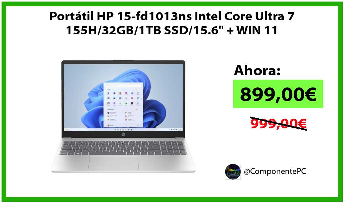 🔹Portátil HP 15-fd1013ns Intel Core Ultra 7 155H/32GB/1TB SSD/15.6" + WIN 11 solo 899,00€❗️⚡️