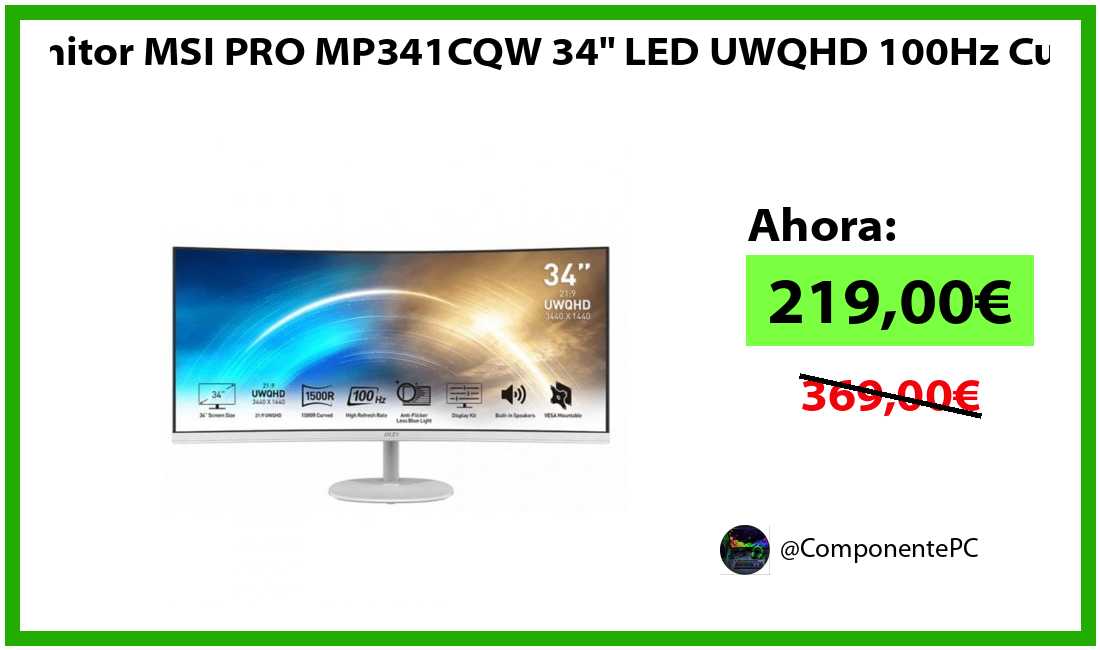 🔹Monitor MSI PRO MP341CQW 34" LED UWQHD 100Hz Curva solo 219,00€❗️⚡️(PVP: 369,00€)