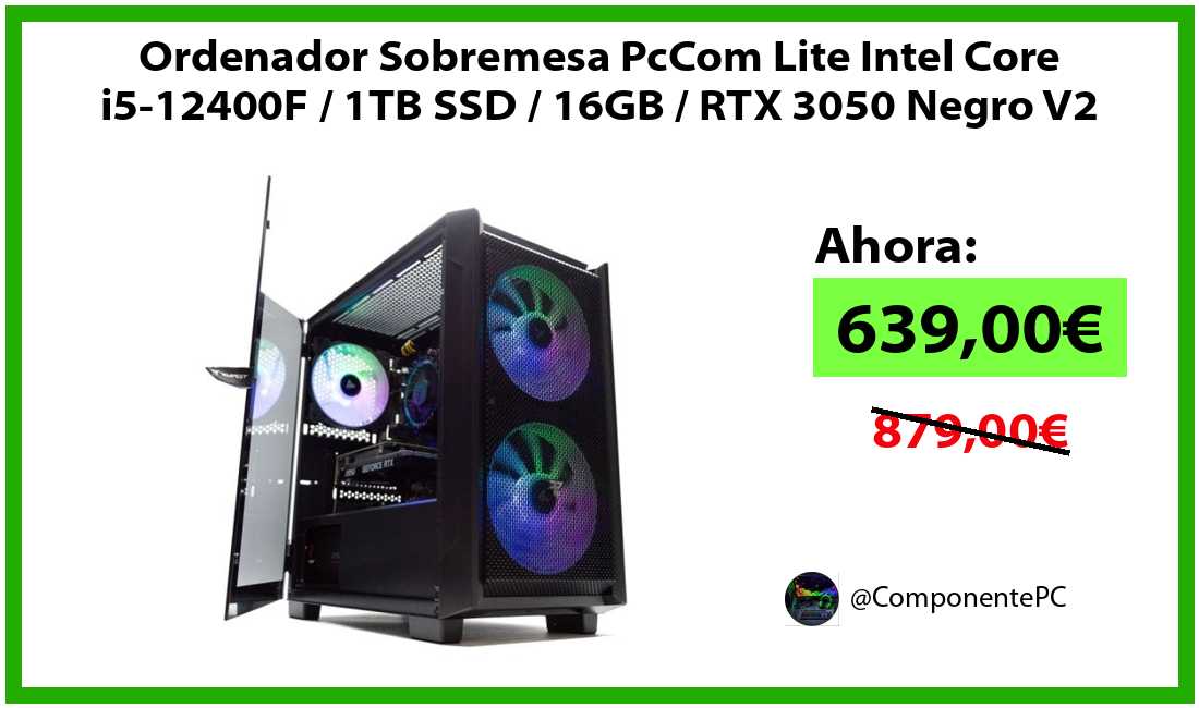 🔹Ordenador Sobremesa PcCom Lite Intel Core i5-12400F / 1TB SSD / 16GB / RTX 3050 Negro V2 solo 639,00€❗️⚡️(PVP: 879,00€)