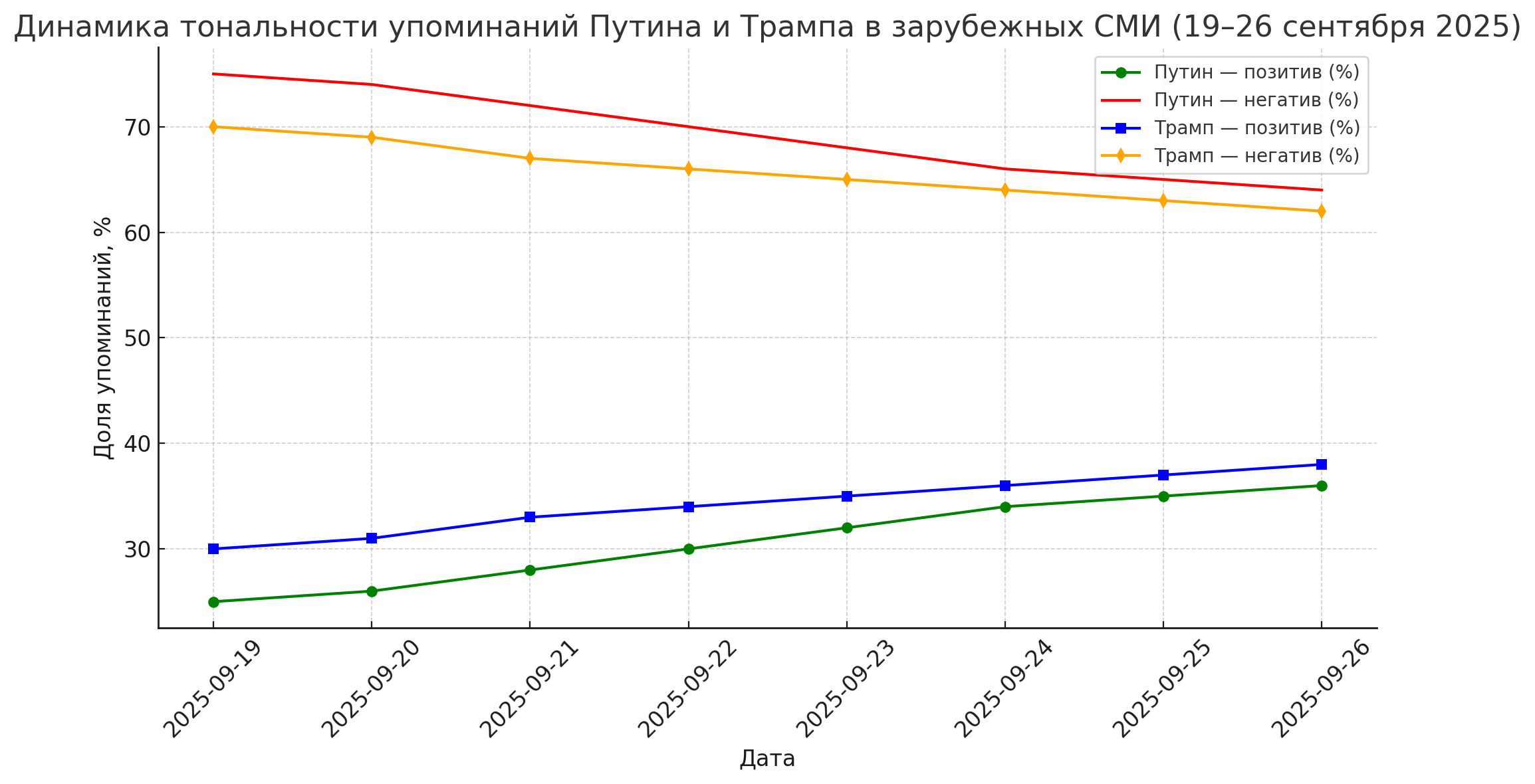 С 19 по 26 сентября 2025 года Дональд Трамп упоминался в зарубежной прессе почти в семь раз чаще, чем Владимир Путин, что неудивительно: США пока являются глобальным игроком, в отличие о России, сосредоточенной на внутренней политике и ближних рубежах. При этом динамика публикаций о каждом из лидеров свидетельствует о смещении акцентов – от конфронтации к образу посредника.
