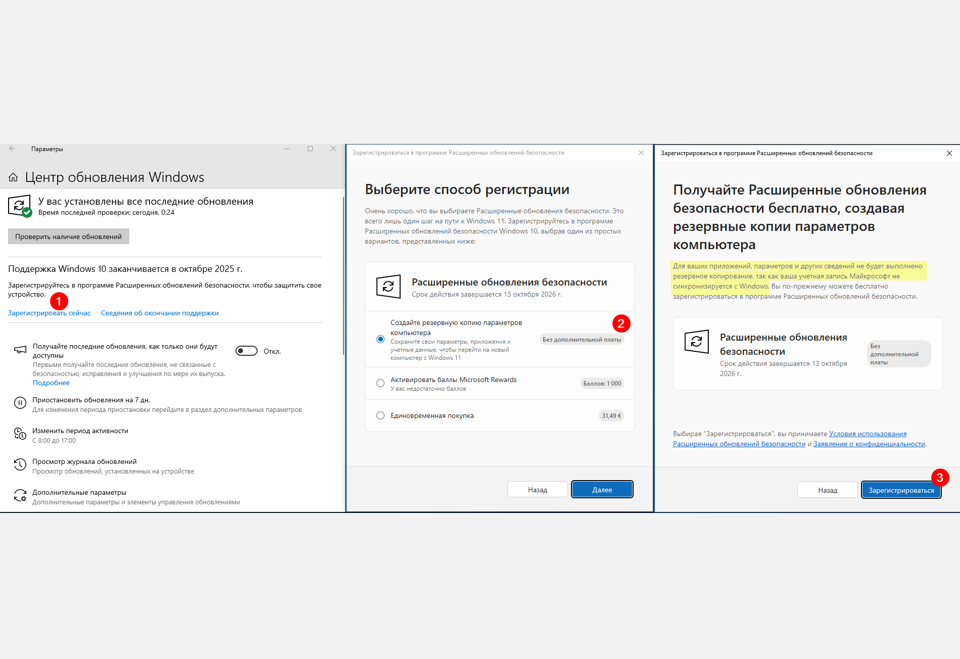 ☁️ Далее, озвучивалось условие, что для вступления в ESU требуется резервное копирование настроек в облако Microsoft. Я проверил. Бэкап невозможен, если у MSA отключена синхронизация с облаком (Учетные записи - Архивация Windows). Однако к ней не принуждают, а лишь уведомляют. И активируют ESU!