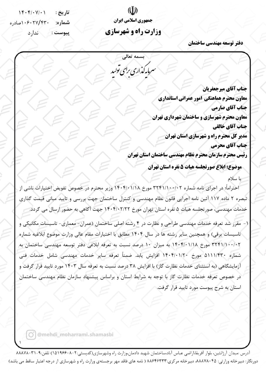 📢 به اطلاع اعضای محترم سازمان نظام مهندسی ساختمان استان تهران میرساند در اجرای نامه شماره ۳۲۴۱/۱۰۰/۰۲ مورخ ۱۴۰۴/۰۱/۱۸ وزیر محترم راه و شهرسازی و بر اساس مصوبه جلسه مورخ ۱۴۰۴/۰۲/۲۲ هیئت ۵ نفره استان تهران، تعرفه خدمات مهندسی سال ۱۴۰۴ به شرح زیر ابلاغ شد: