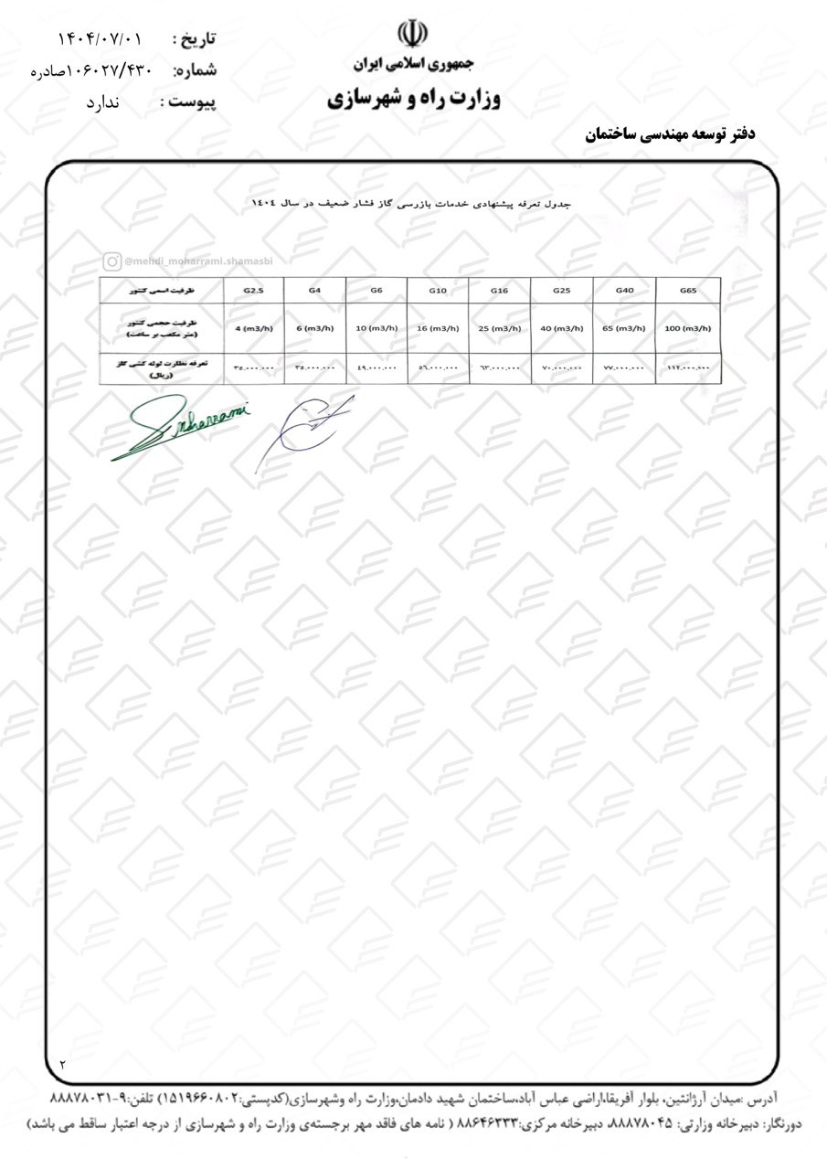 ۳- تعرفه خدمات نظارت گاز نیز با توجه به شرایط استان تهران و بر اساس پیشنهاد سازمان نظام مهندسی ساختمان استان، به شرح پیوست مورد تأیید قرار گرفت.
