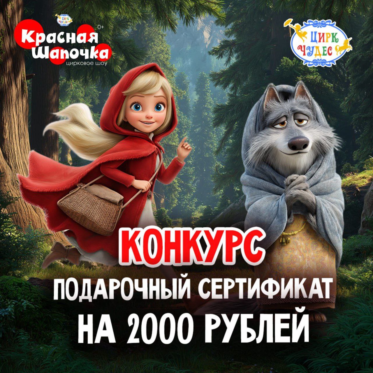 5 сертификатов номиналом 2000 рублей для покупки билетов на премьерные показы нового большого циркового шоу "Красная Шапочка"